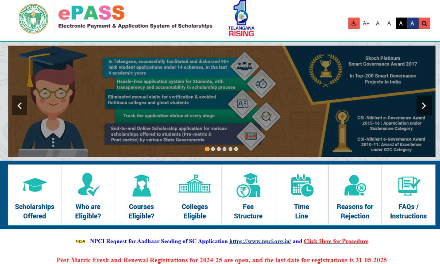 The e-PASS system, available at http://telanganaepass.cgg.gov.in, is the state’s flagship digital platform for managing scholarship disbursements to students from Scheduled Castes, Scheduled Tribes, Backward Classes, Economically Backward Classes, Minority communities, and students with disabilities.
