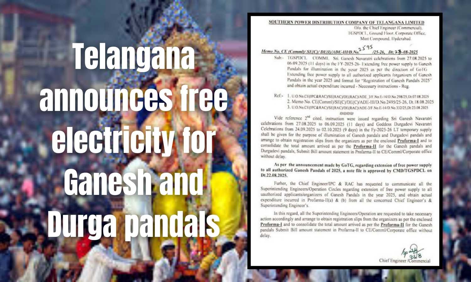 The Telangana Southern Power Distribution Company Limited (TGSPDCL) released official orders to implement the scheme. The facility will cover Vinayaka Navaratri from August 27 to September 6 and Durga Navaratri from September 29 to October 12. However, only organisers with prior approval will qualify.