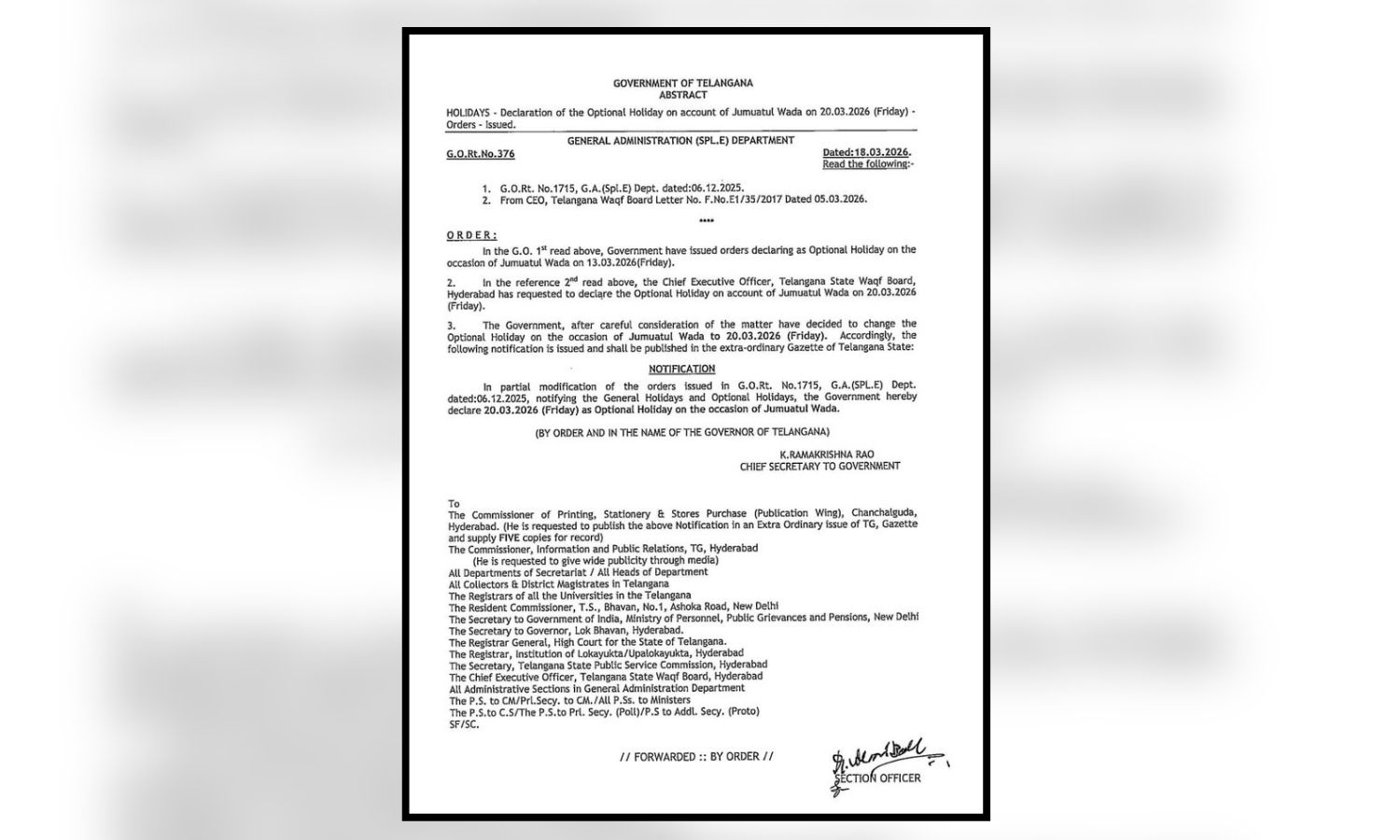Government of Telangana issued G.O.Rt. No. 376 dated 18.03.2026 declaring March 20, 2026 (Friday) as an Optional Holiday on account of Jumuatul Wada. pic.twitter.com/GfNDhCqQBP