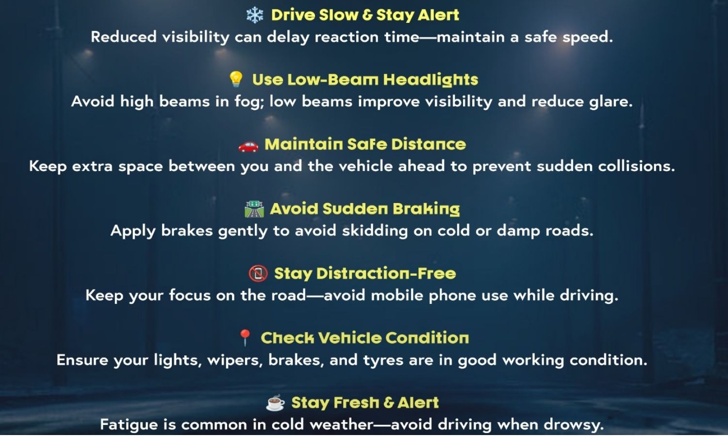 The department also reminded road users to stay within marked lanes. Lane changes in fog created blind spots and made movement harder to predict.