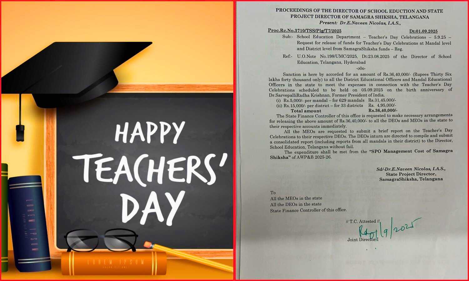 State Project Director Dr. E. Naveen Nicolas, IAS, issued the order to allocate the funds. District Educational Officers (DEOs) and Mandal Educational Officers (MEOs) will receive the amount to organise local-level programmes. The event celebrates the birth anniversary of former President Dr. Sarvepalli Radhakrishnan.