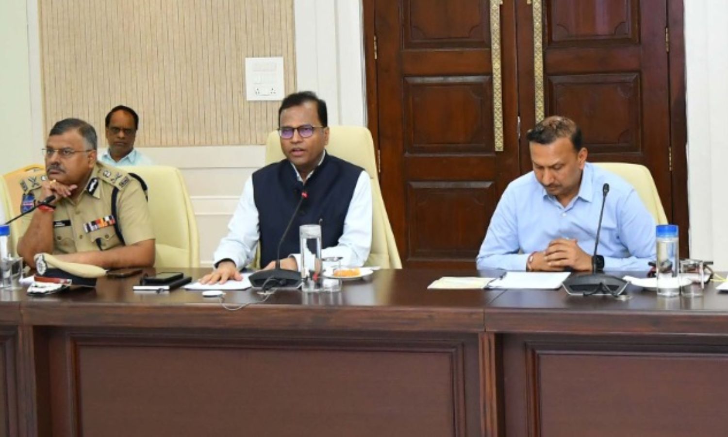 Senior officials including DGP Jitender, Special Chief Secretaries Vikas Raj and Ravi Gupta, Principal Secretary Naveen Mittal, GHMC Commissioner R.V. Karnan, and Police Commissioner C.V. Anand were among those present at the meeting.