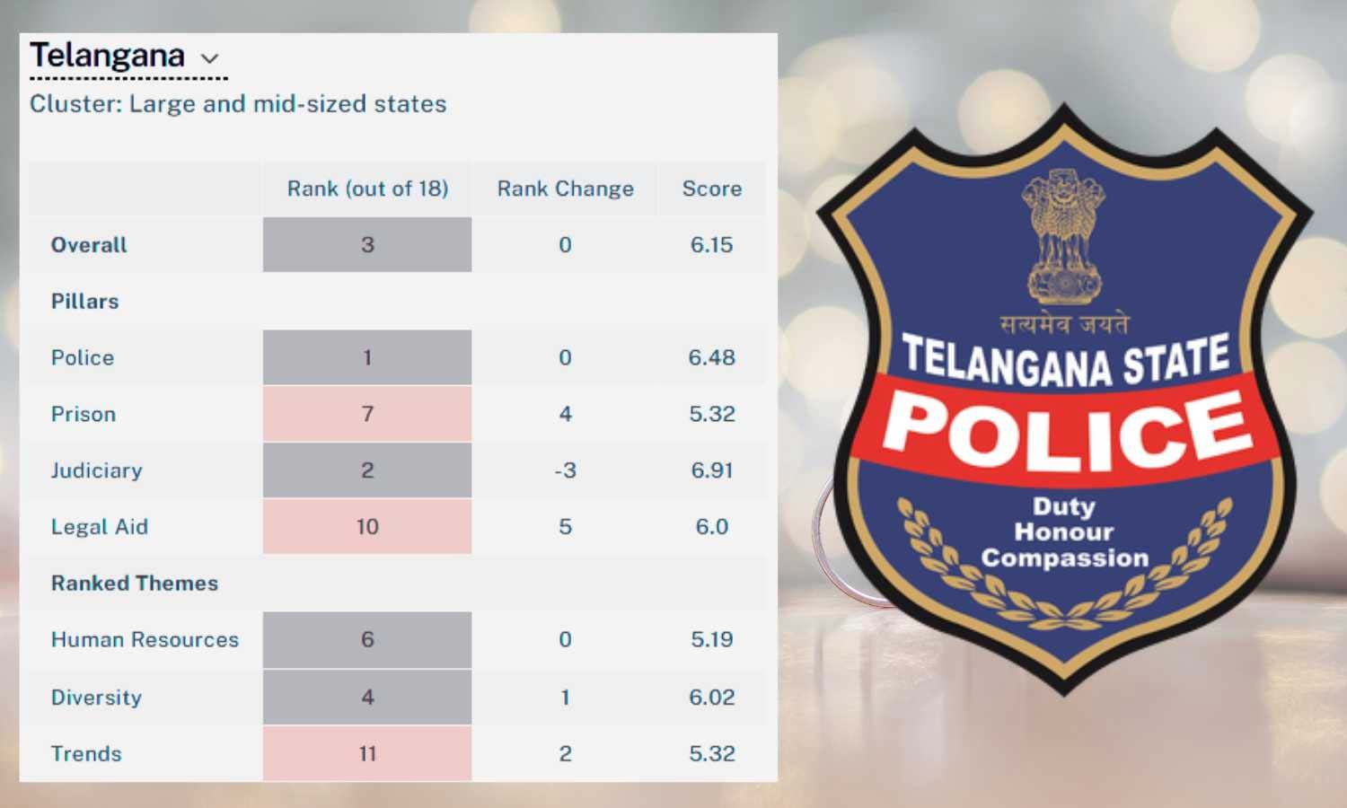 The India Justice Report, compiled by respected institutions including Tata Trusts, Centre for Social Justice, and Common Cause, placed Telangana at the forefront for its policing standards among 18 large states. The Chief Minister described this as a proud moment for the state, attributing the honour to the unwavering efforts and dedication of the Telangana Police.