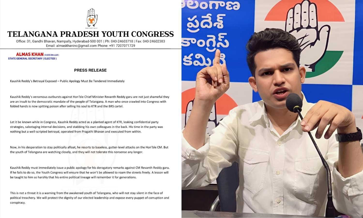 In a press release issued by State General Secretary Almas Khan, the organisation accused Kaushik Reddy of acting as a planted agent of BRS leader K.T. Rama Rao during his time in Congress. The statement alleges that Reddy leaked confidential party strategies, undermined internal decisions, and ultimately betrayed the party’s trust.