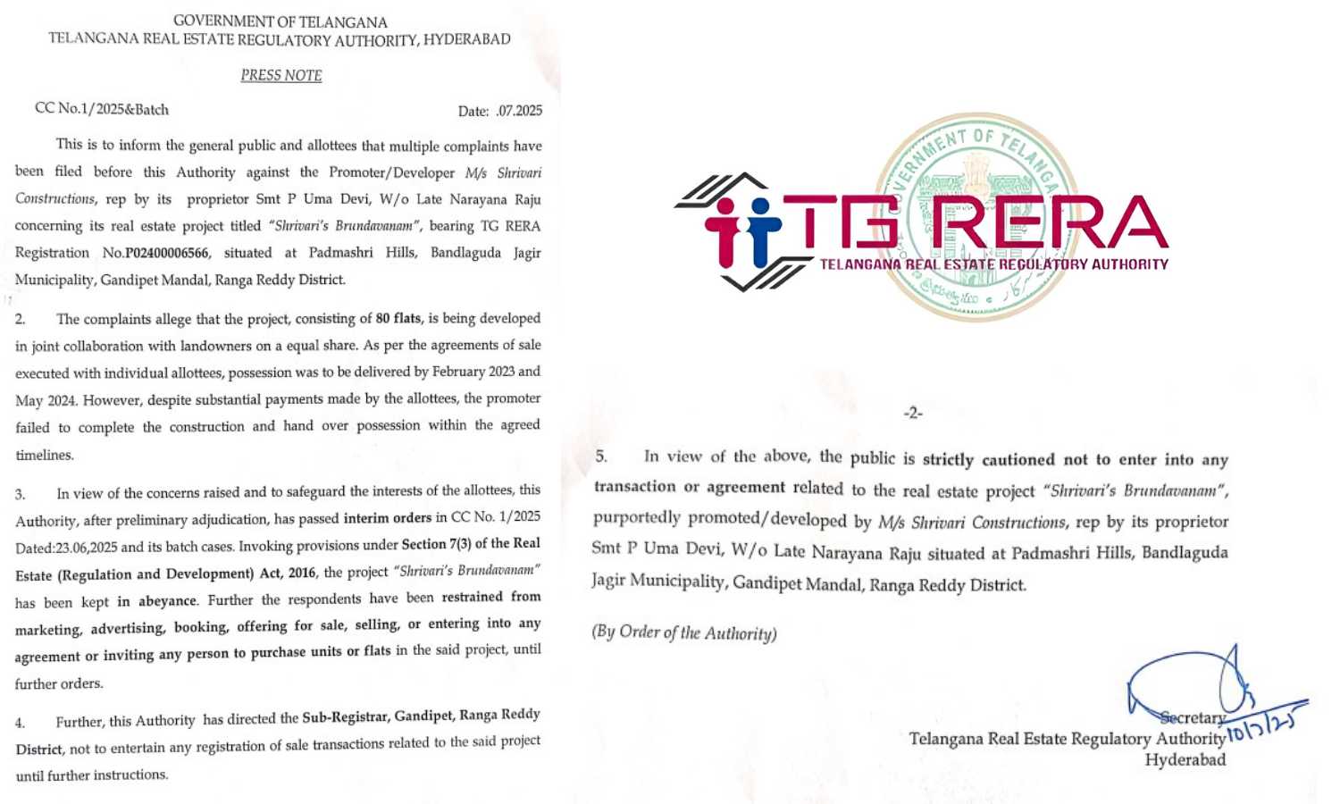 TGRERA issued the cautionary notice after receiving grievances against developer Shrivari Constructions, which had entered into a joint development agreement with landowners to build 80 flats on a 50:50 sharing model.