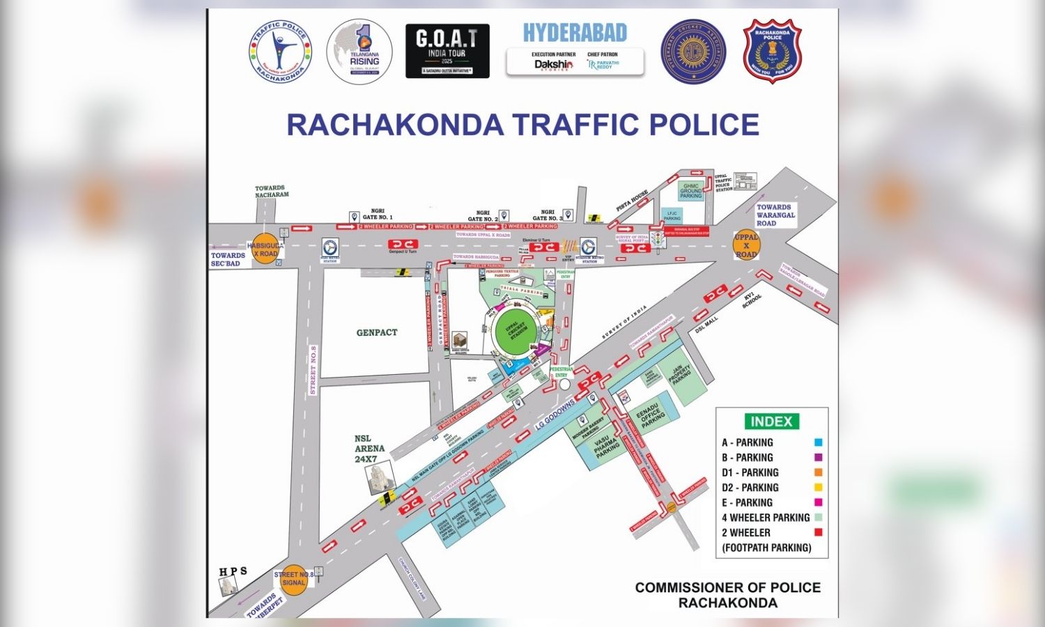 In view of the MESSI Tour & Live Event at Rajiv Gandhi International Cricket Stadium, Uppal on 13.12.2025, moderate traffic congestion is expected. Traffic diversions will be in effect within the limits of Uppal Traffic PS.