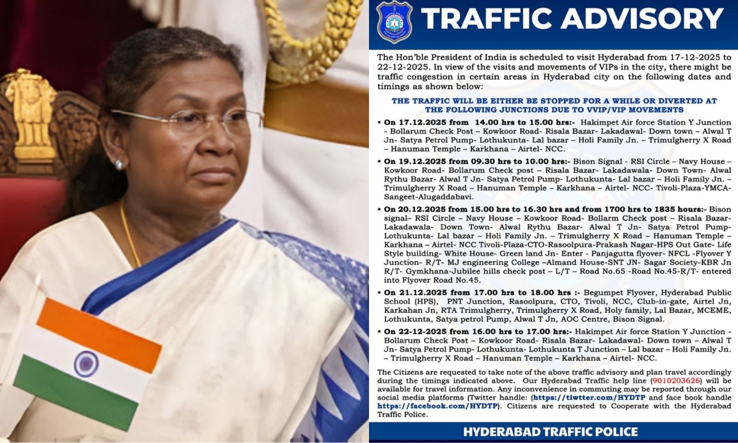 Hyderabad: Hyderabad Police will enforce traffic restrictions across the city from December 17 to December 22 due to President Droupadi Murmu’s visit.