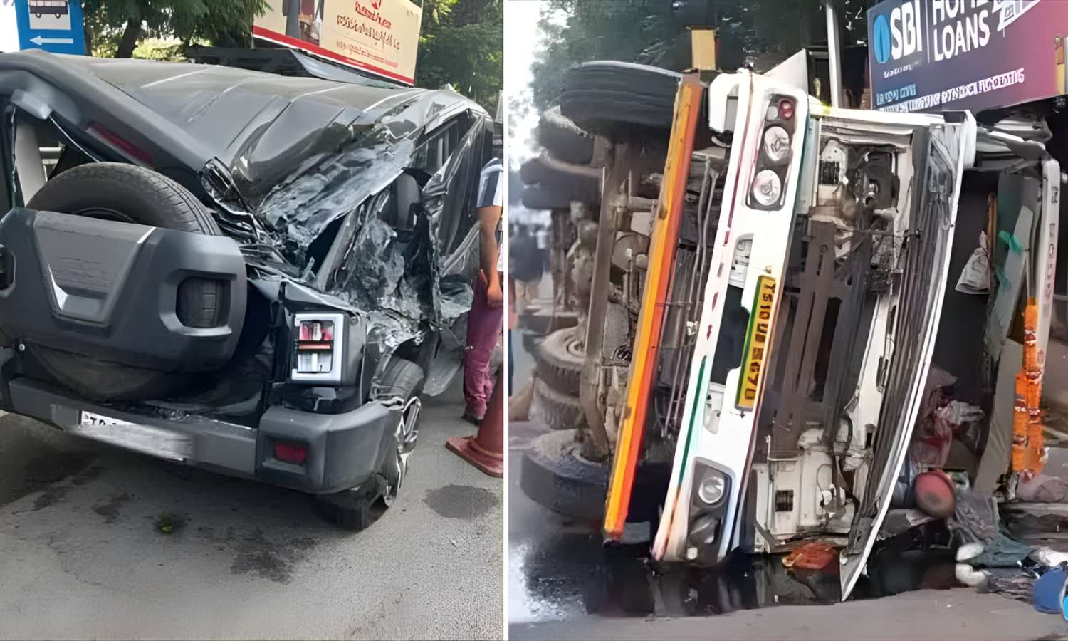 Hyderabad: A major road accident occurred near the Begumpet bus stop in Hyderabad on Tuesday morning when a heavy-load truck rammed into a Mahindra Thar SUV from behind, severely damaging the vehicle and overturning due to the force of the impact.