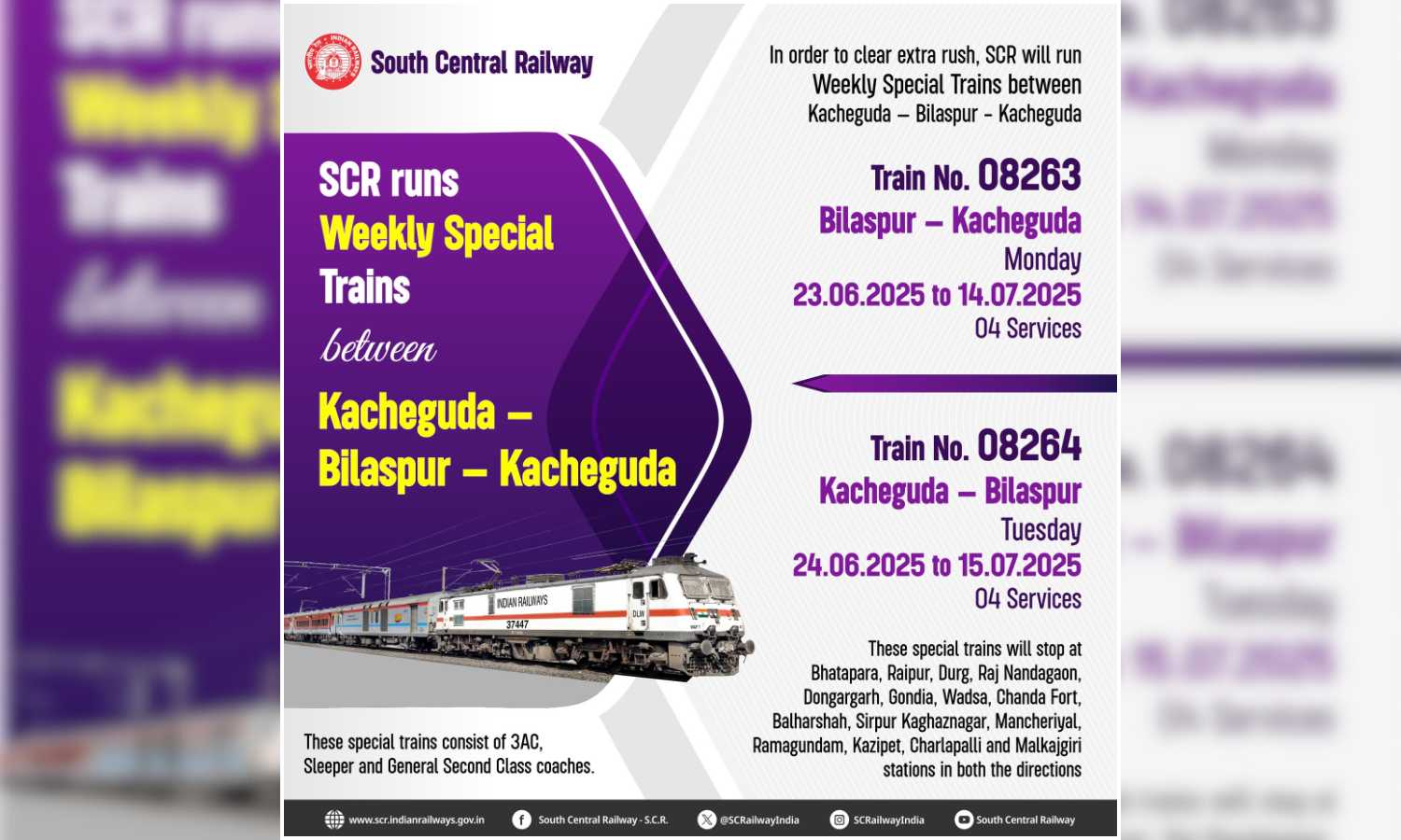 Hyderabad: To manage increased passenger traffic, South Central Railway will run weekly special trains between Kacheguda and Bilaspur from June 24 to July 15.