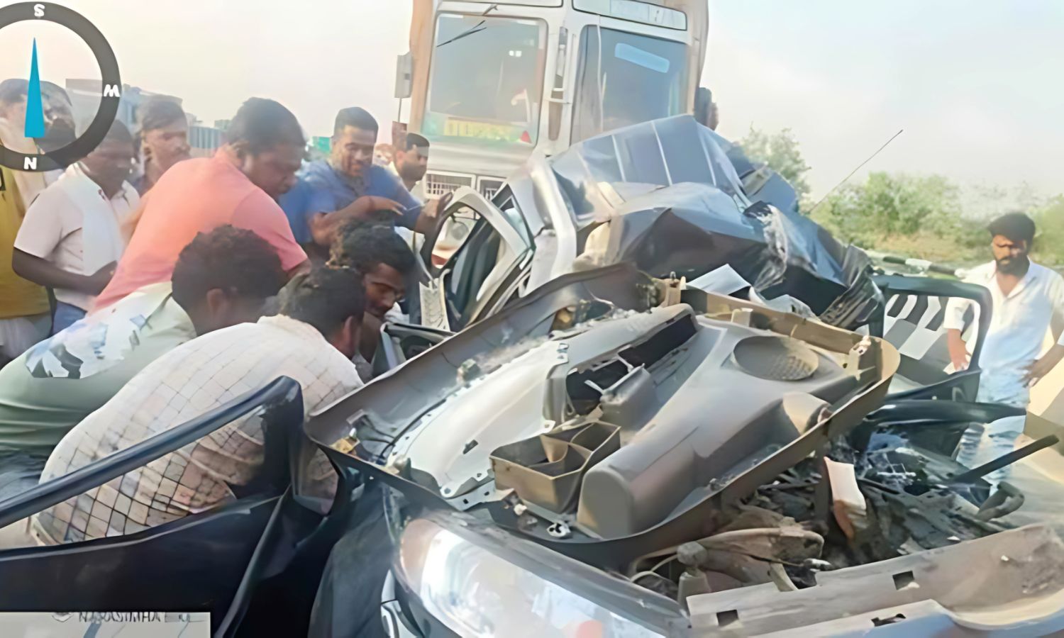 The car was completely mangled in the collision. One of the occupants, Shobharani (50), died on the spot. Her husband Ellareddy, her mother Vimalamma, and the car driver sustained injuries. The DCM, after being hit, also collided with the scooter, injuring the rider, identified as Raghupati Reddy.