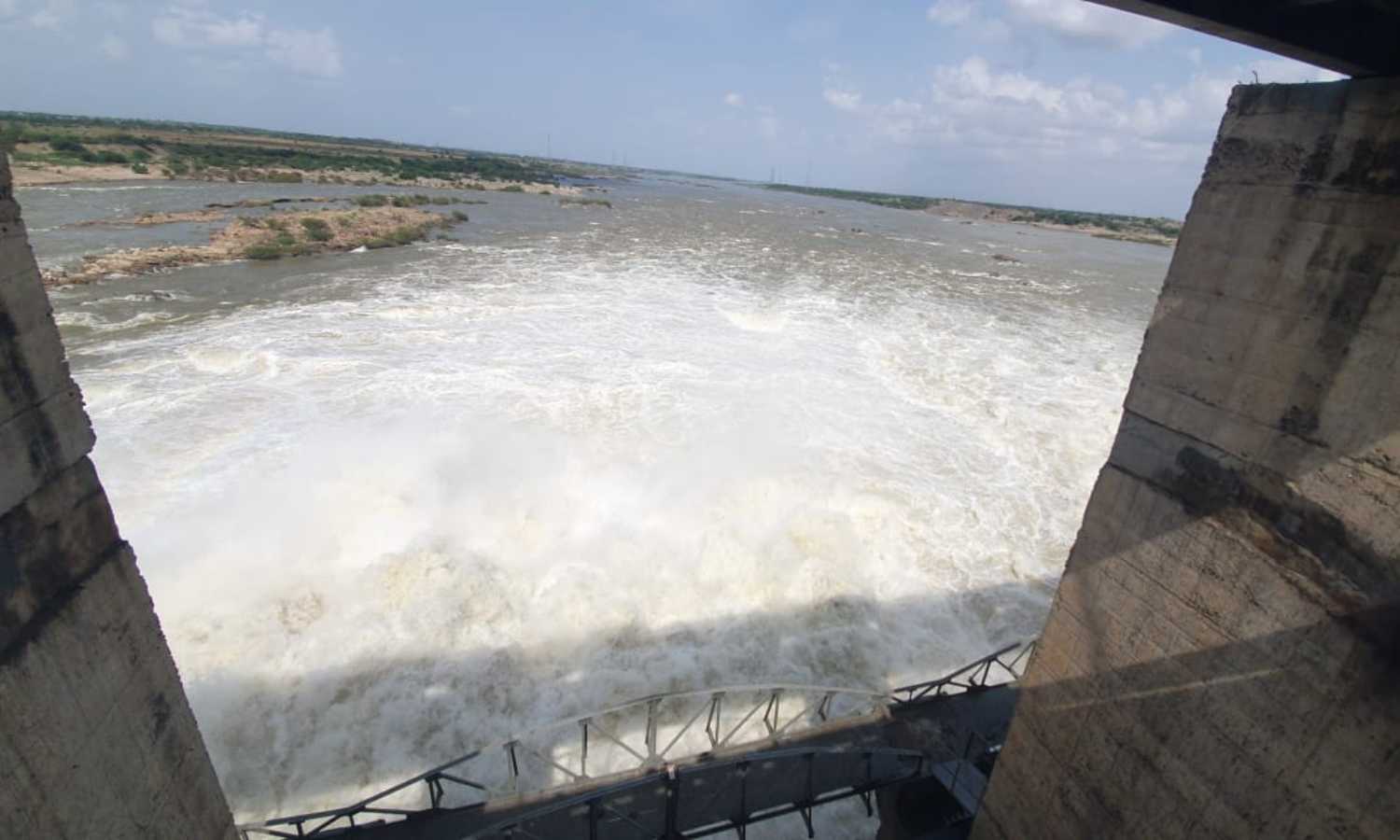 To manage the surge, authorities opened 12 gates, releasing 1.15 lakh cusecs through the spillway. An additional 25,691 cusecs was discharged through power generation, bringing the total outflow to 1,42,830 cusecs.