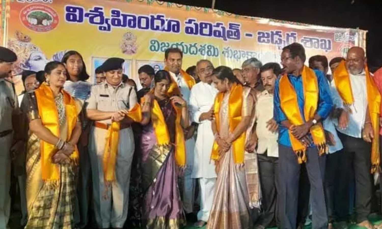 Hyderabad: Jadcherla MLA Janampalli Anirudh Reddy and Mahbubnagar SP Janaki took part in Ravana Dahanam celebrations at the Degree College Grounds in Jadcherla town on Thursday evening. Large crowds gathered to witness the Dasara event.