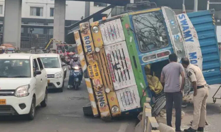 HYDERABAD: A container-laden lorry overturned near Lakdikapool on its way from Moosapet to Katedan, leading to a major traffic jam in the area. The incident occurred when the vehicle lost balance while navigating a turn at Lakdikapool.