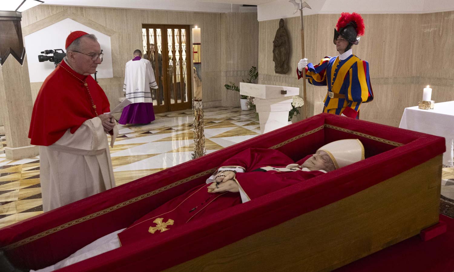 The Pope’s body is currently lying in repose in a coffin for public viewing, accompanied by continuous prayers from the clergy and religious followers.