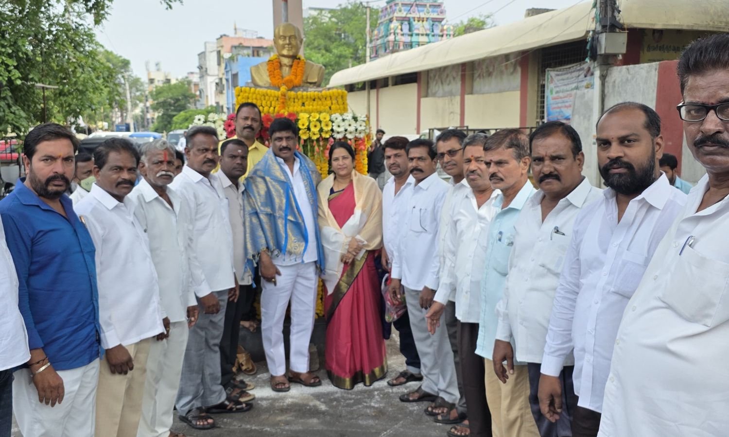 Hyderabad: On the 34th death anniversary of former Prime Minister Rajiv Gandhi, floral tributes were paid at his statue in Manikesav Nagar by Greater Hyderabad Deputy Mayor Mote Srilatha Shobhan Reddy and Telangana Trade Union Congress (TTUC) state president Mote Shobhan Reddy.