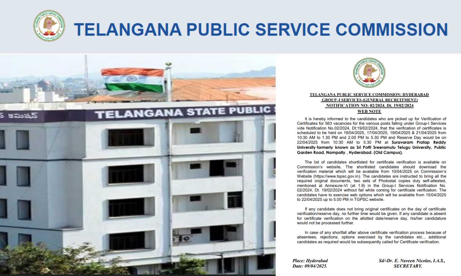 HYDERABAD: The Telangana State Public Service Commission (TSPSC) has released the schedule for document verification of candidates selected for TSPSC Group-1 posts. The verification will take place on April 16, 17, 19, and 21 at Suravaram Pratap Reddy University in Nampally.